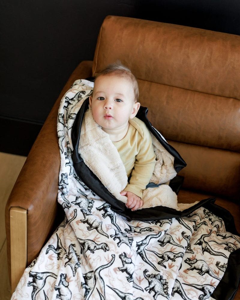 $3.75 – $26.850 out of 5Details: The Big Dino blanket brings prehistoric fun to kids’ spaces with black and tan dinosaurs on a white background. Perfect for young dino enthusiasts. it’s a cozy and playful addition to their room or bedtime routine. This blanket is backed in a tan?plush minky with a black?satin ruffle. Dimensions: Sizing is approximate and based…