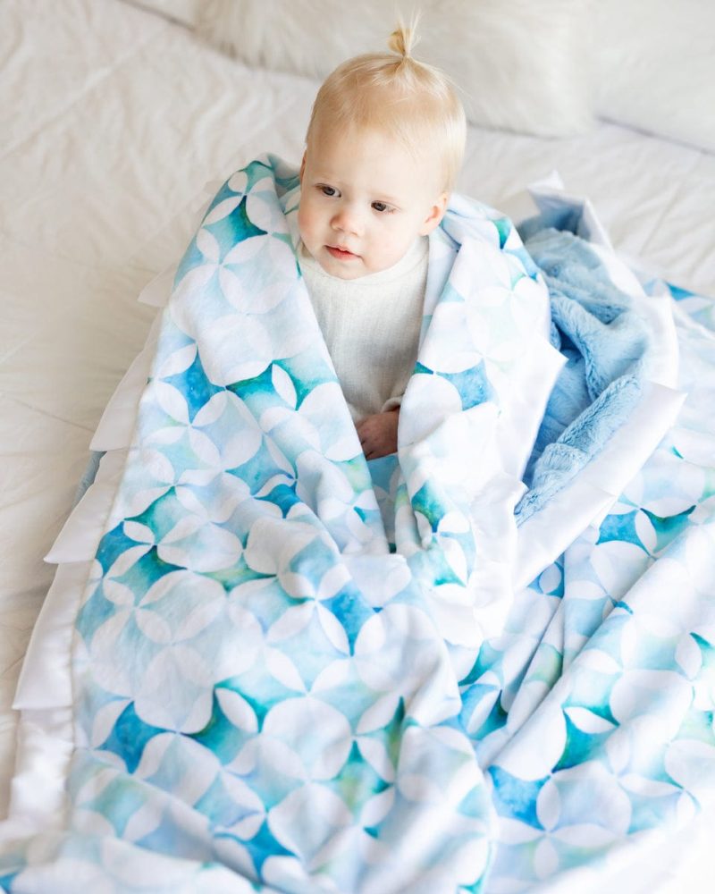 $3.75 – $35.850 out of 5Details: Embrace the gentle elegance of our Blue Pinwheel Blanket featuring a soothing light blue watercolor design reminiscent of whimsical pinwheels in motion.? Wrap yourself in its tranquil hues. inviting a sense of calm and relaxation into your home.?This blanket is backed in a light blue plush minky and sewn with a white?satin ruffle. Dimensions:…