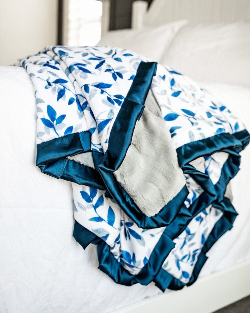$3.75 – $35.850 out of 5Details: Experience the serene sophistication of our Blue Leaves Blanket. showcasing a tranquil white canvas adorned with subtle blue and gray leaf motifs. Wrap yourself in the soothing embrace of these delicate leaves. adding a sense of peaceful refinement to your surroundings.?This blanket is backed in a?gray plush minky and sewn with a navy blue…