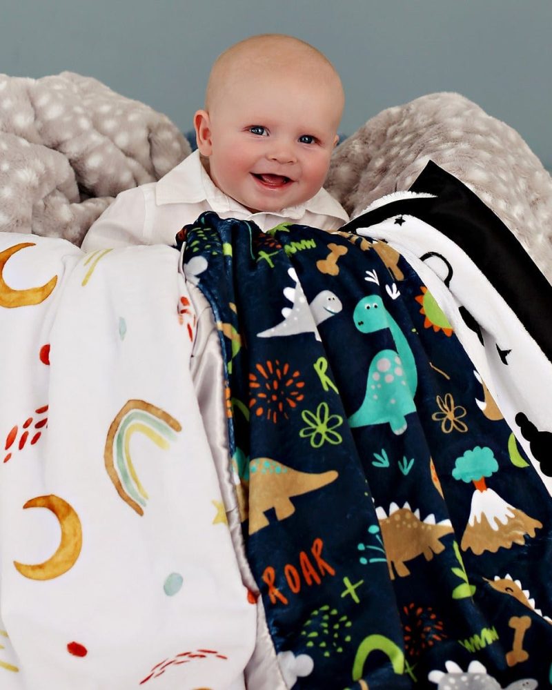 $3.75 – $35.850 out of 5Details:?Dinosaurs and volcanos in the jungle need to be snuggled too! Wrap your little one in the fun of a land full of dinos.? Dinosaur Land?is?a Minky Couture mid-weight pattern blanket. Mid-weight blankets have shorter minky threads that create a silky feel. This blanket is backed with an navy plush minky fabric and bordered in…