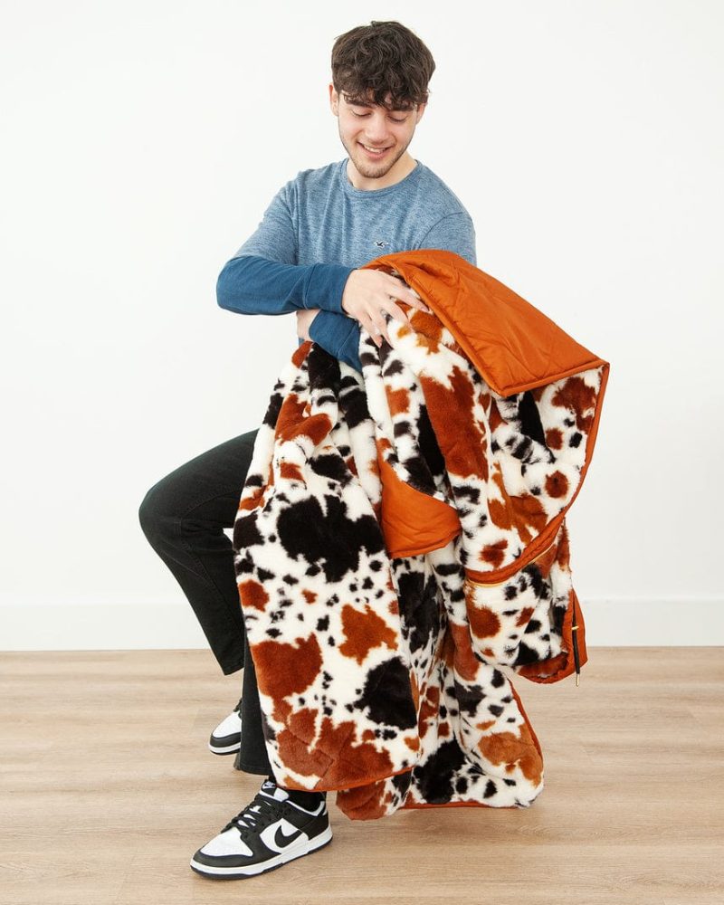 0 out of 5$299Original price was: $299.$89.70Current price is: $89.70.Outdoor blanket perfect for a picnic. watching sports games. camping. the rodeo and more! Outer lining is solid camel brown with a cow print plush fabric interior in shades of brown. Dimensions: Approximately 60×63 Water resistant quilted backing Plush minky lining Hood. Folds into a pocket when not in use. detachable via zipper. Hand-holds in…