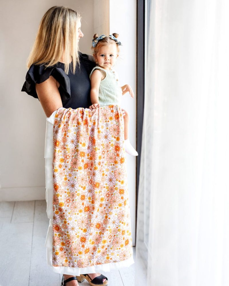 $3.75 – $35.850 out of 5Details:?This blanket features variety of orange. pink. yellow and coral bohemian style flowers of different sizes. This?blanket is backed in a?peach?plush minky and sewn with a white satin ruffle. Dimensions: Sizing is approximate and based on pre-sewn measurements. Mini: 10×18 0.5 lbs Infant: 30×36 1.4 lbs Tween:? 36×50 2.0 lbs Adult:? 50×60 3.4 lbs Monster:?…