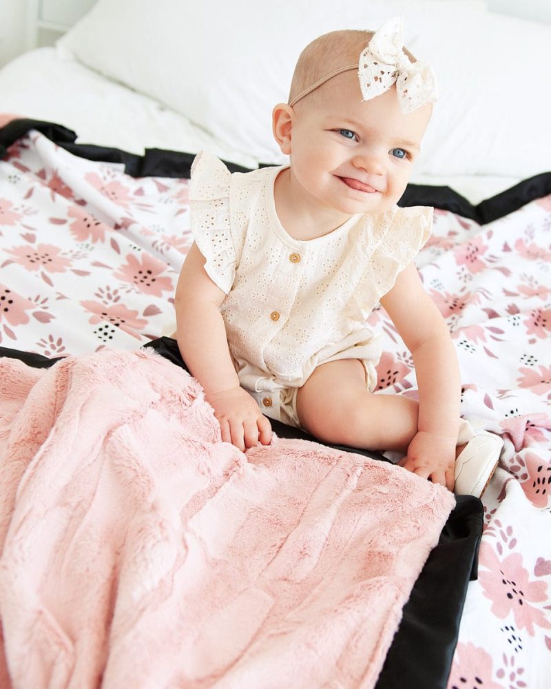 $3.75 – $35.850 out of 5Details:?The Blush Wildflower Blanket showcases a beautiful floral print on a crisp white background. bringing a soft and airy charm to any space. Its plush fabric offers cozy comfort while the delicate design adds a touch of elegance. This blanket is backed in a blush plush minky with a cream?satin ruffle. ? Dimensions: Sizing is…