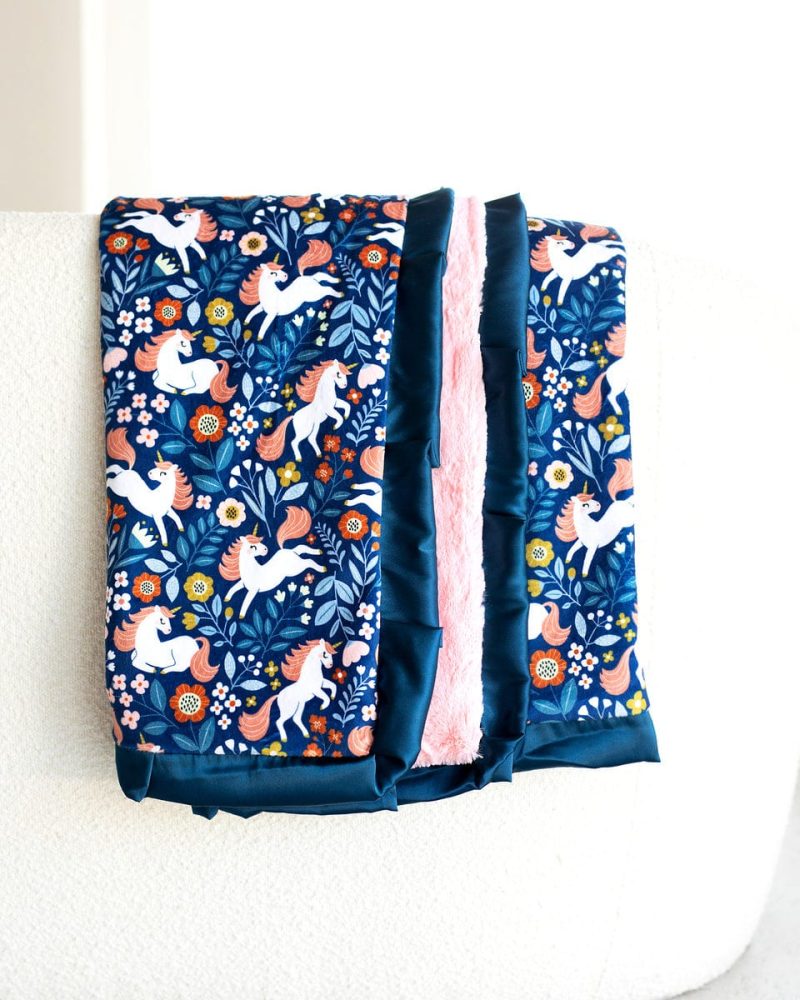 $3.75 – $35.850 out of 5Details:?This blanket includes beautiful unicorns. flowers and greenery on a navy blue background. This?blanket is backed in a?peach?plush minky and sewn with a navy satin ruffle. Dimensions: Sizing is approximate and based on pre-sewn measurements. Mini: 10×18 0.5 lbs Infant: 30×36 1.4 lbs Tween:? 36×50 2.0 lbs Adult:? 50×60 3.4 lbs Monster:? 60×72 4.8 lbs…
