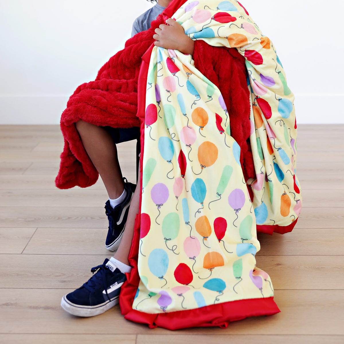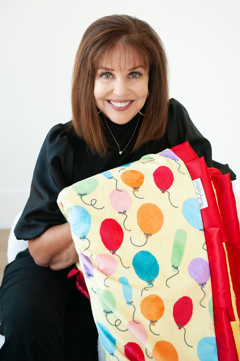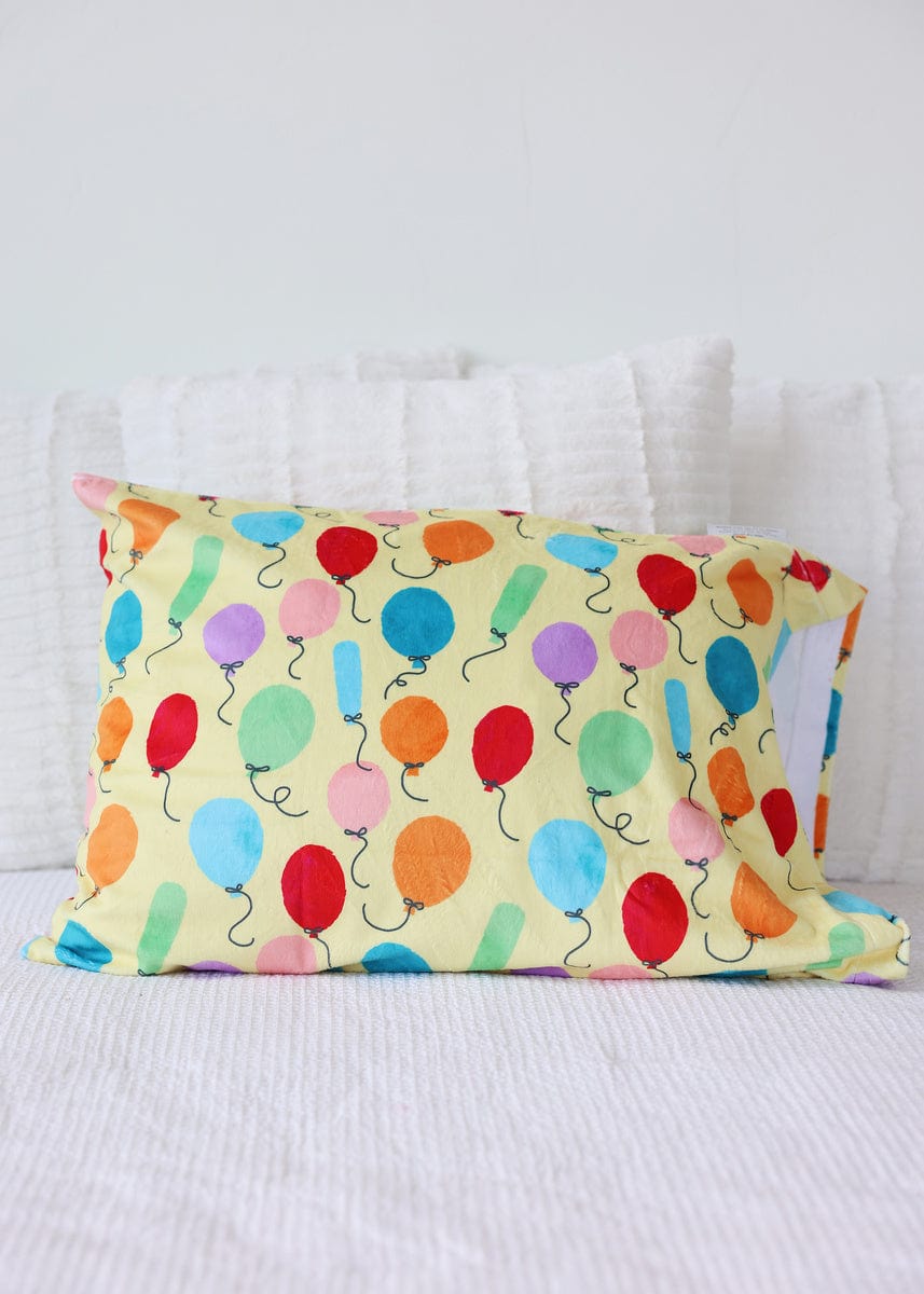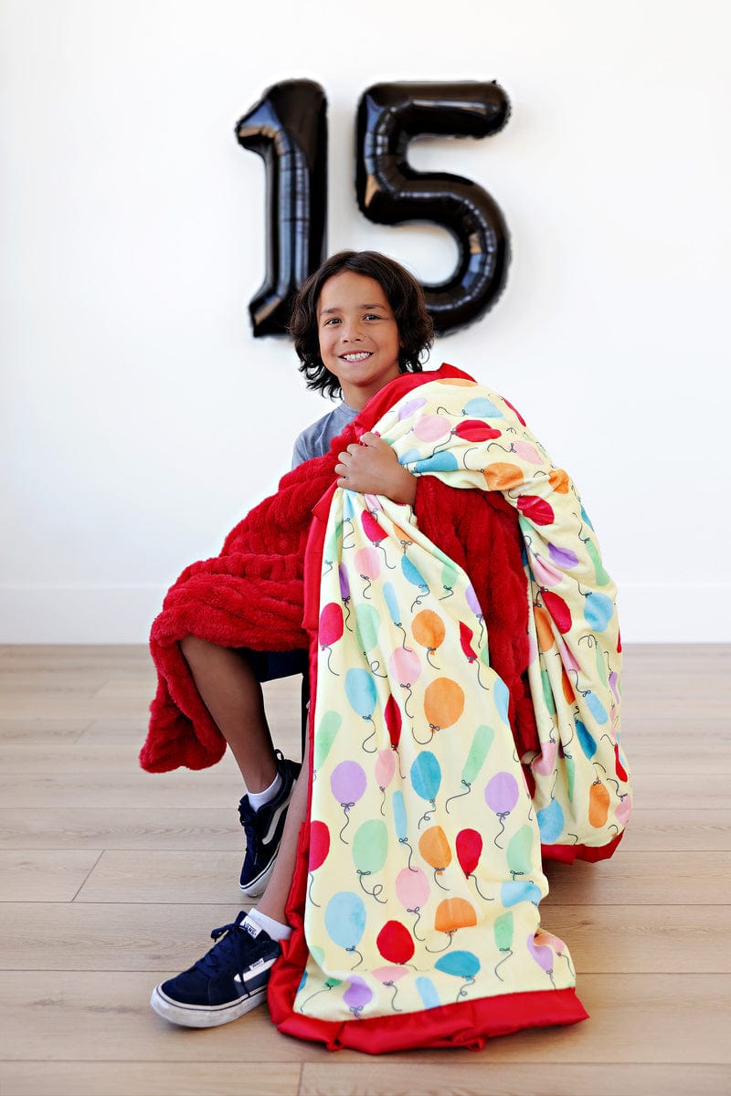 - Details: Lift your spirits with the Birthday Balloon Blanket! Decorated with a playful mix of colorful balloons floating across a cheerful light yellow background. Complete your festive ensemble with the matching pillowcase. making it perfect for birthday festivities or simply adding a joyful touch to your everyday d??cor. This blanket is backed in a light yellow plush minky and sewn with a red satin ruffle.