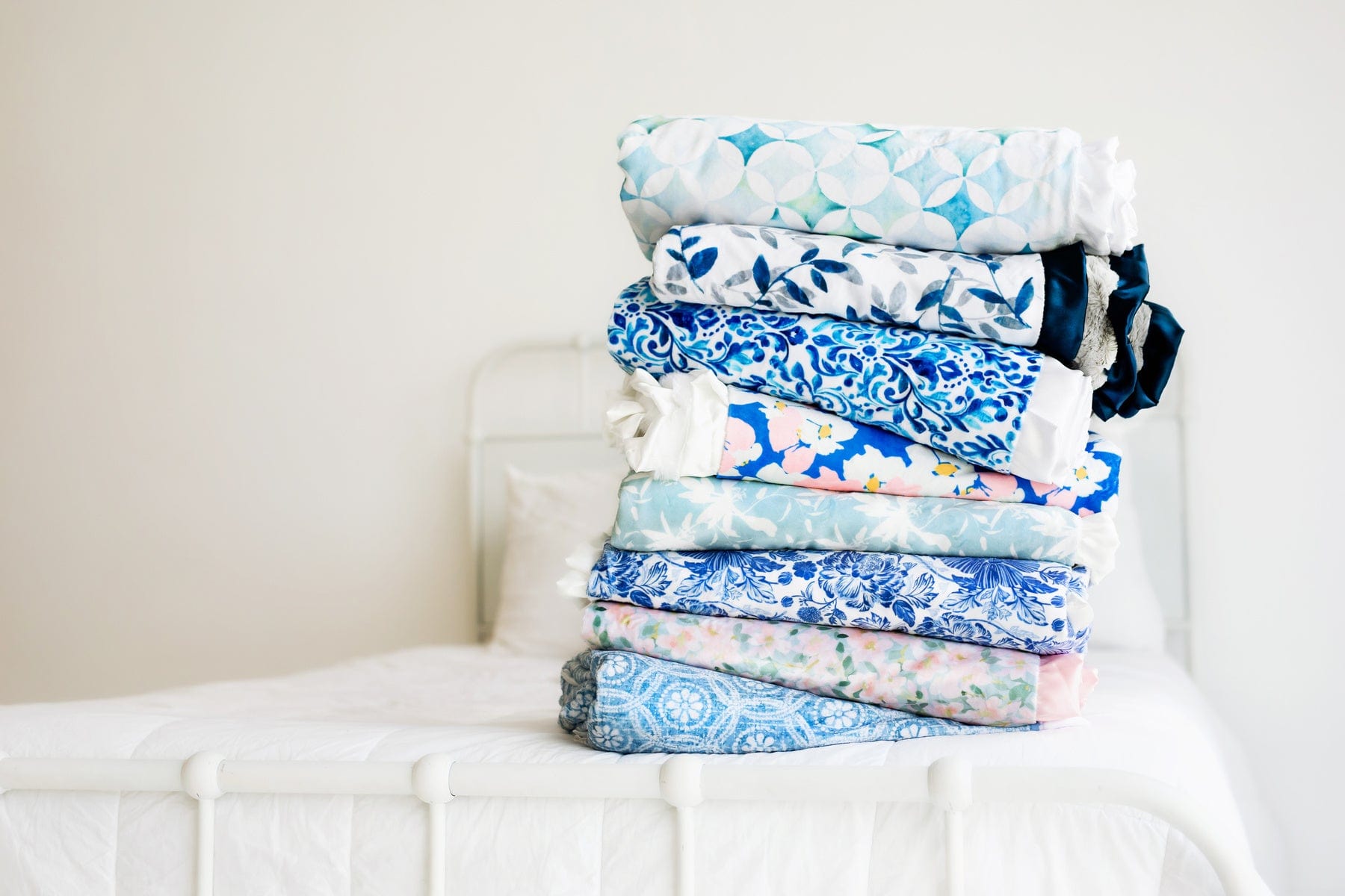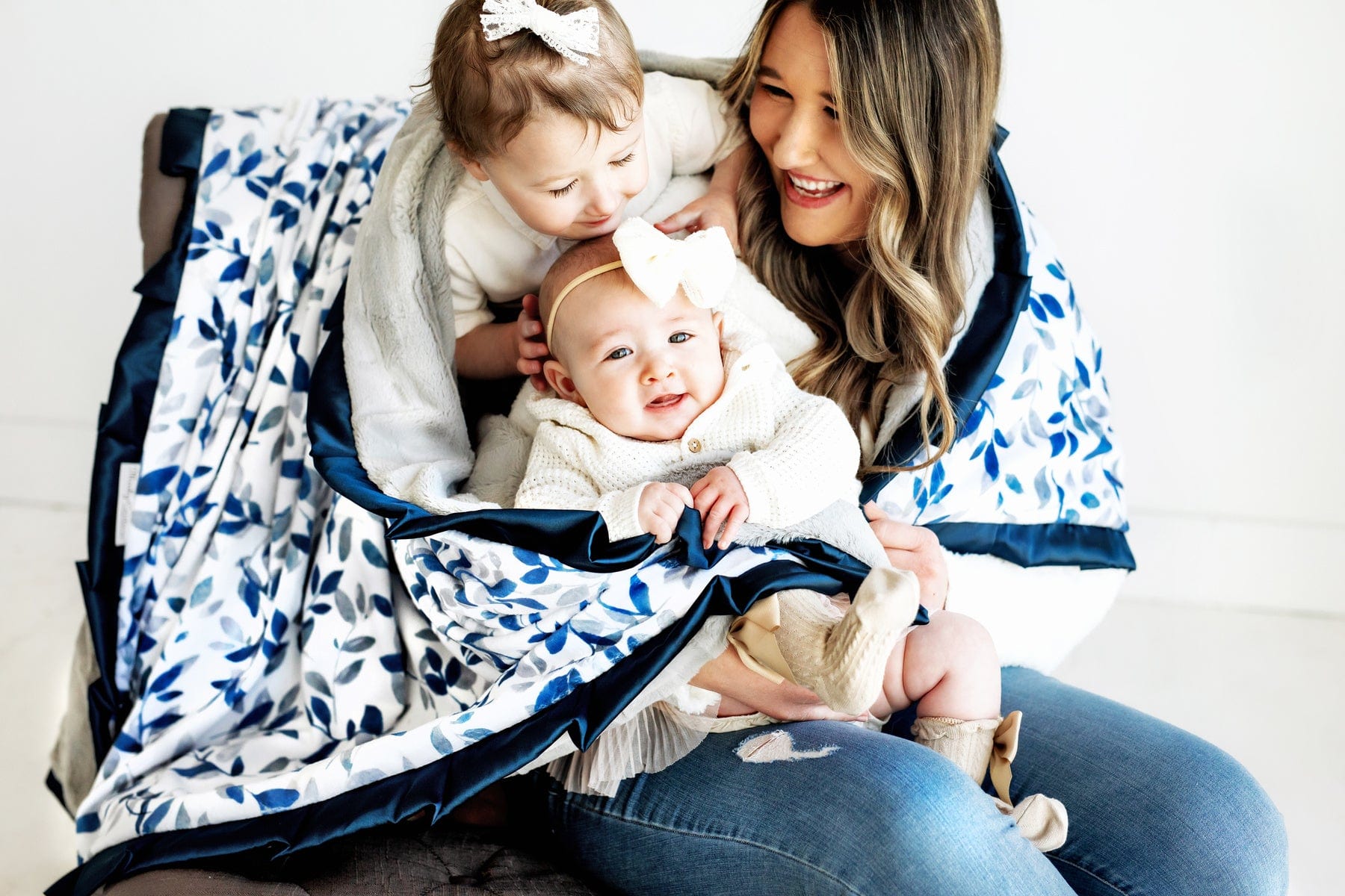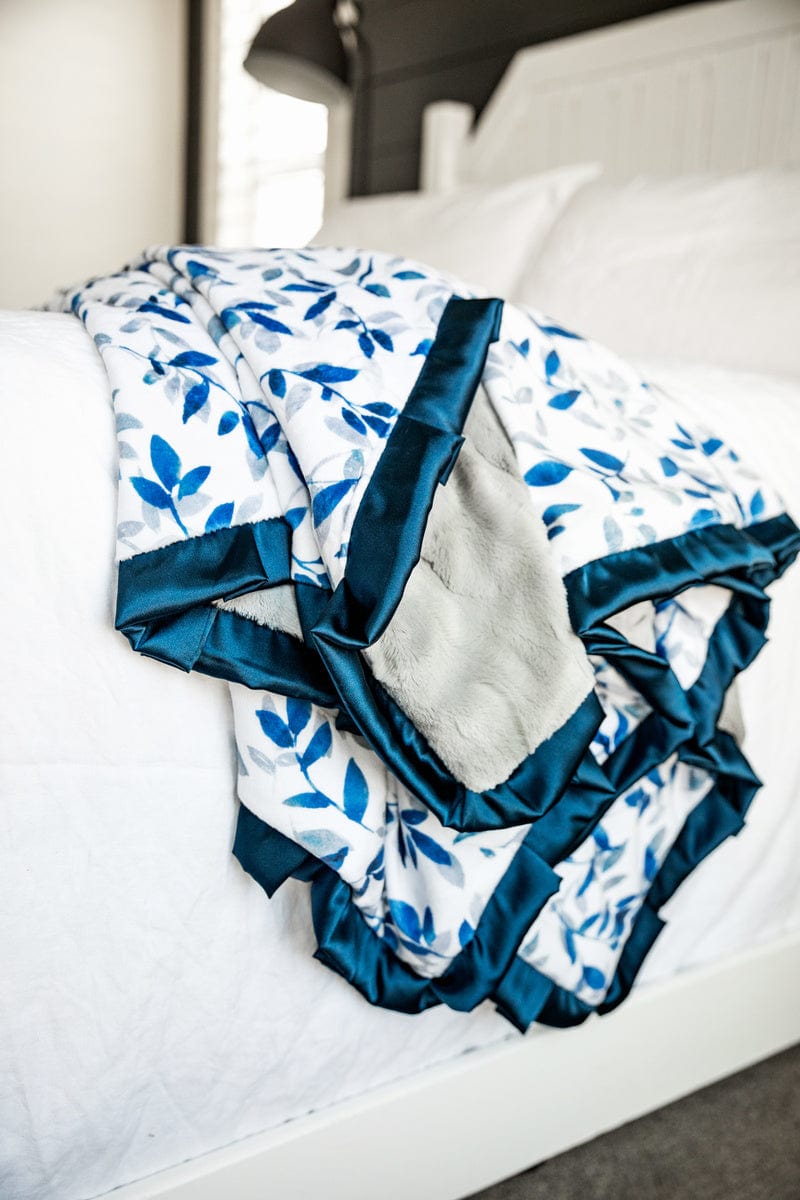 - Details: Experience the serene sophistication of our Blue Leaves Blanket. showcasing a tranquil white canvas adorned with subtle blue and gray leaf motifs. Wrap yourself in the soothing embrace of these delicate leaves. adding a sense of peaceful refinement to your surroundings.?This blanket is backed in a?gray plush minky and sewn with a navy blue satin ruffle.