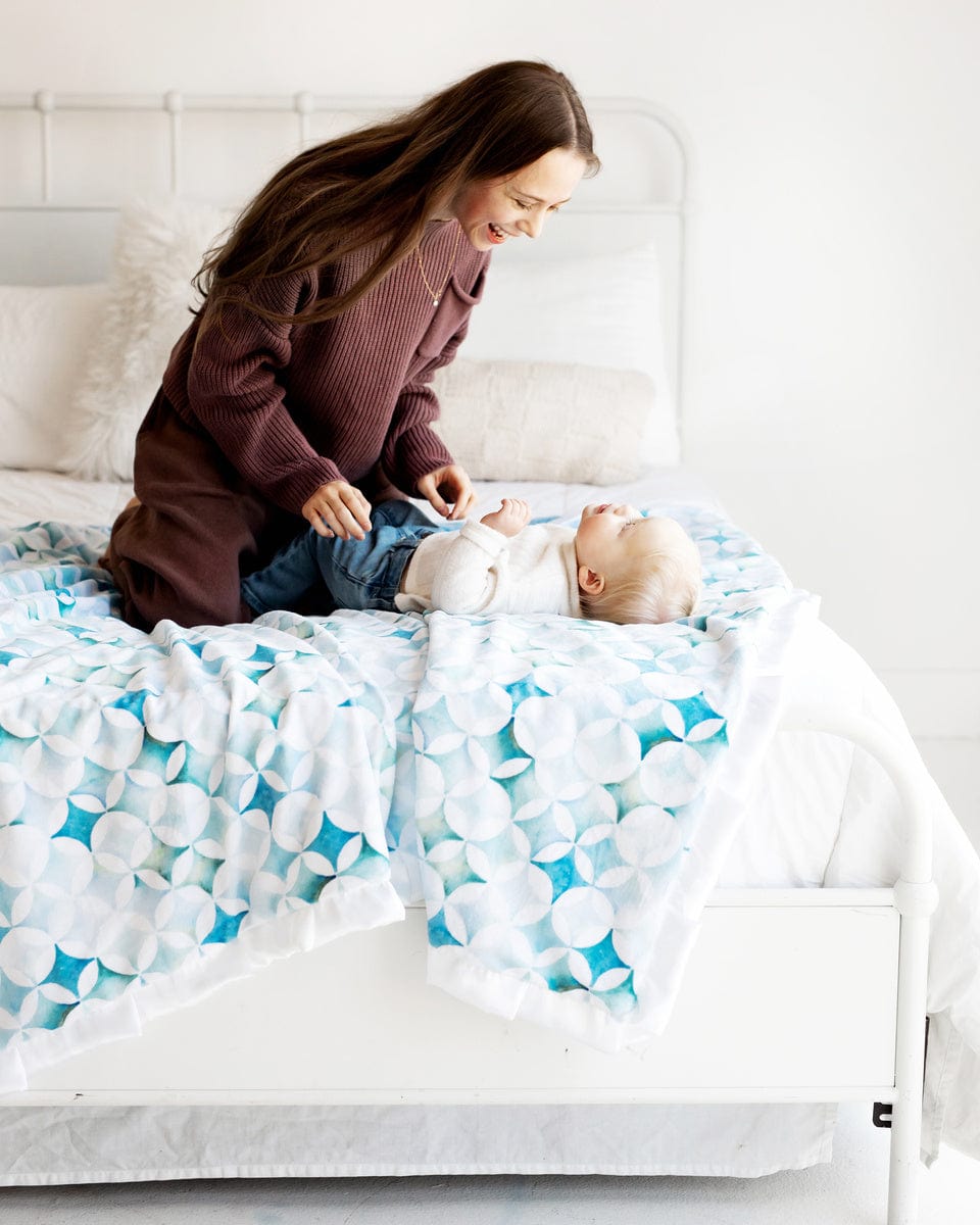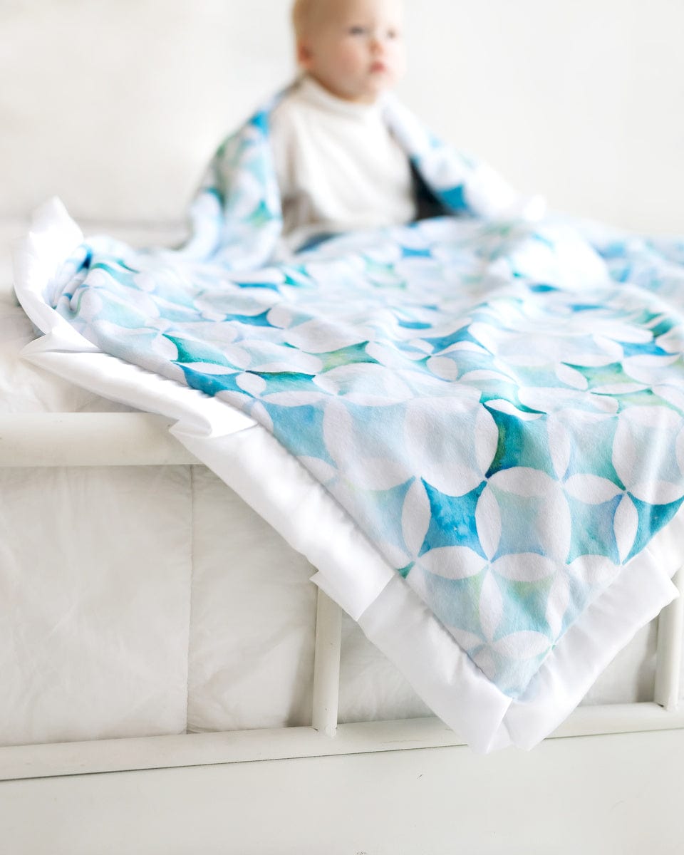 - Details: Embrace the gentle elegance of our Blue Pinwheel Blanket featuring a soothing light blue watercolor design reminiscent of whimsical pinwheels in motion.? Wrap yourself in its tranquil hues. inviting a sense of calm and relaxation into your home.?This blanket is backed in a light blue plush minky and sewn with a white?satin ruffle.