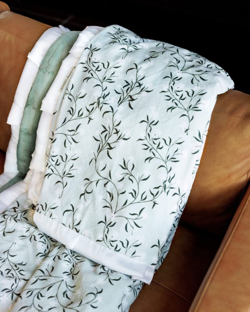 - Details:?Discover the timeless elegance of our Blue Willow Blanket. featuring a serene white canvas intricately adorned with a delicate array of navy blue flowers and foliage. Reminiscent of classic porcelain patterns. this blanket exudes a refined charm. adding a touch of sophistication to your home decor.?This blanket is backed in a cream plush minky and sewn with a matching white?satin ruffle.