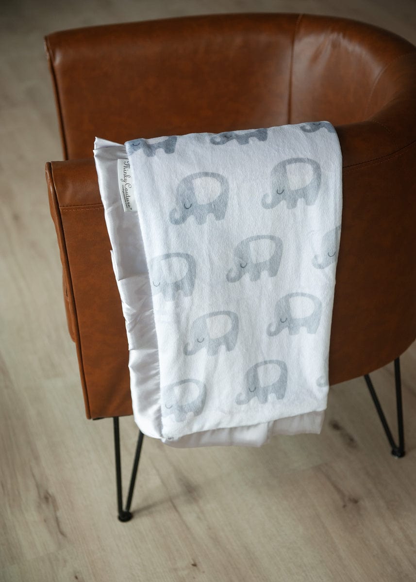 • Details: Snuggle up in style with this cozy blanket featuring adorable silver elephants on a soft white background. Perfect for adding a touch of whimsy and comfort to any space!?This blanket is backed with a?silver plush minky and sewn with a matching silver?satin ruffle.