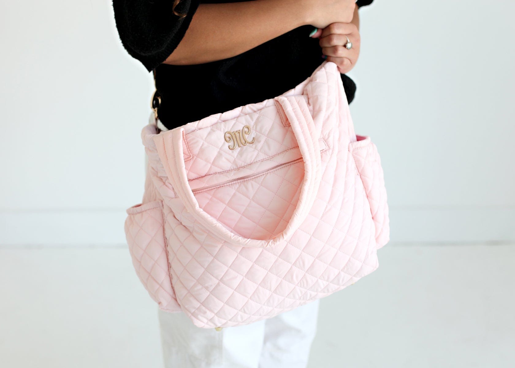 Introducing the Everything Bag – the epitome of versatility and style! This exceptional bag effortlessly combines a fashion-forward light pink quilted fabric with a highly functional design. Whether you’re embarking on a travel adventure. need a reliable diaper bag. hitting the gym. or simply seeking an everyday companion. the Everything Bag has got you covered. With a dozen pockets and easy-to-clean material. it offers ample storage while maintaining a pristine appearance