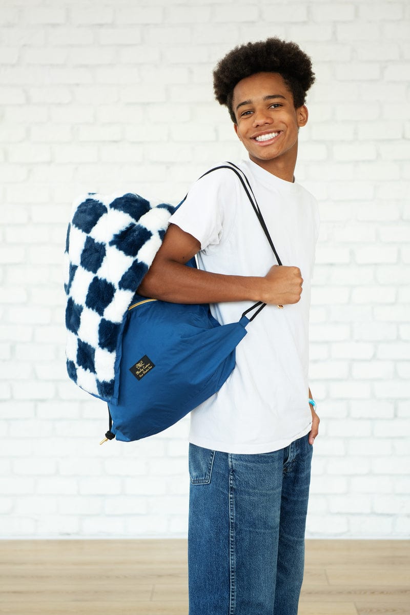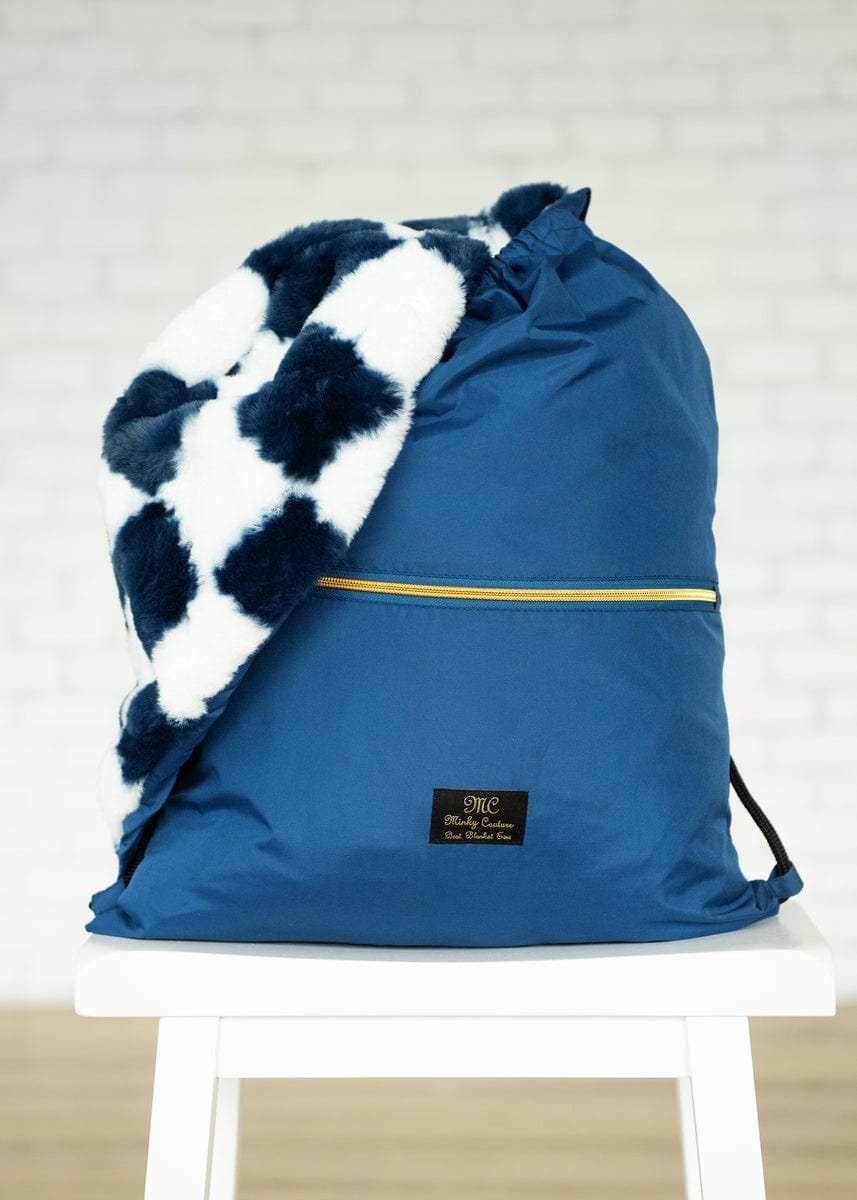 Outdoor blanket perfect for a picnic. watching sports games. camping. the rodeo and more! Outer lining is solid blue with a blue and white checkered plush fabric interior.