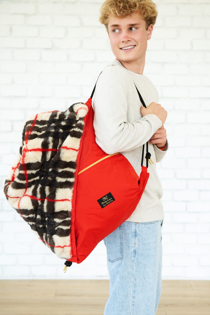 Outdoor blanket perfect for a picnic. watching sports games. camping. the rodeo and more! Outer lining is solid red with a red. black and white plaid plush fabric interior.