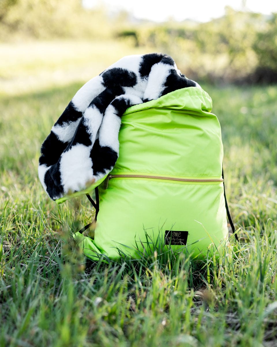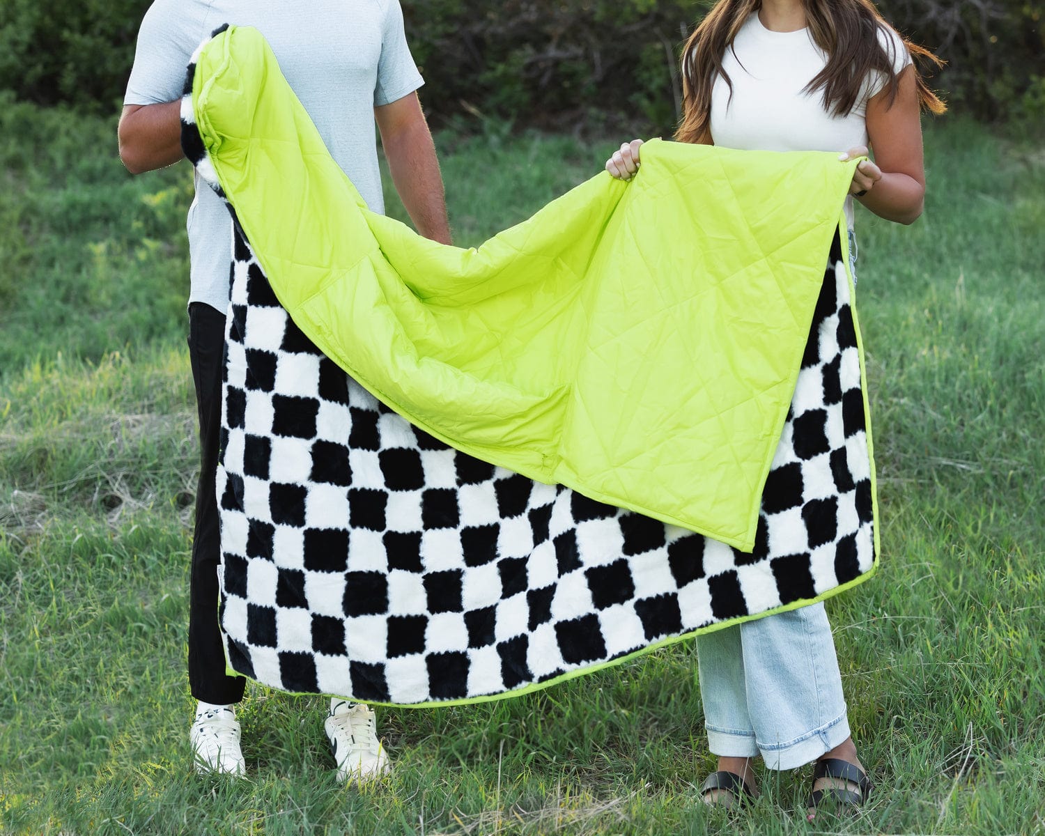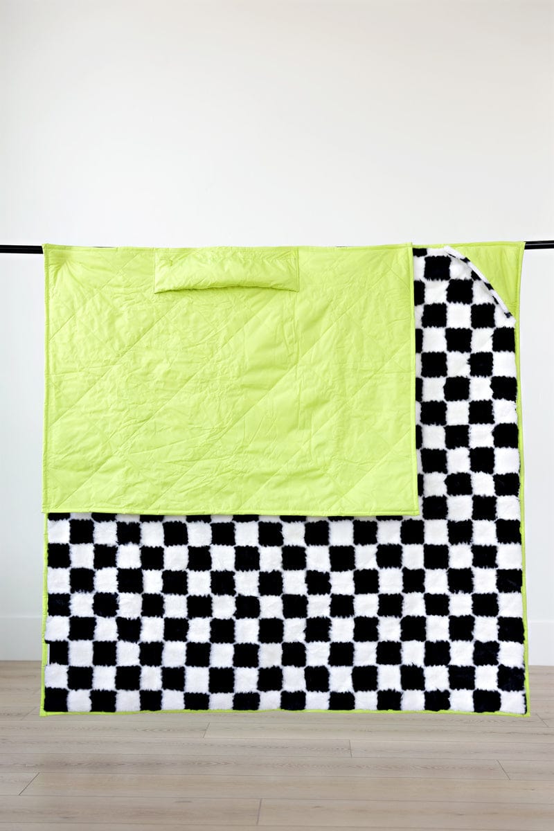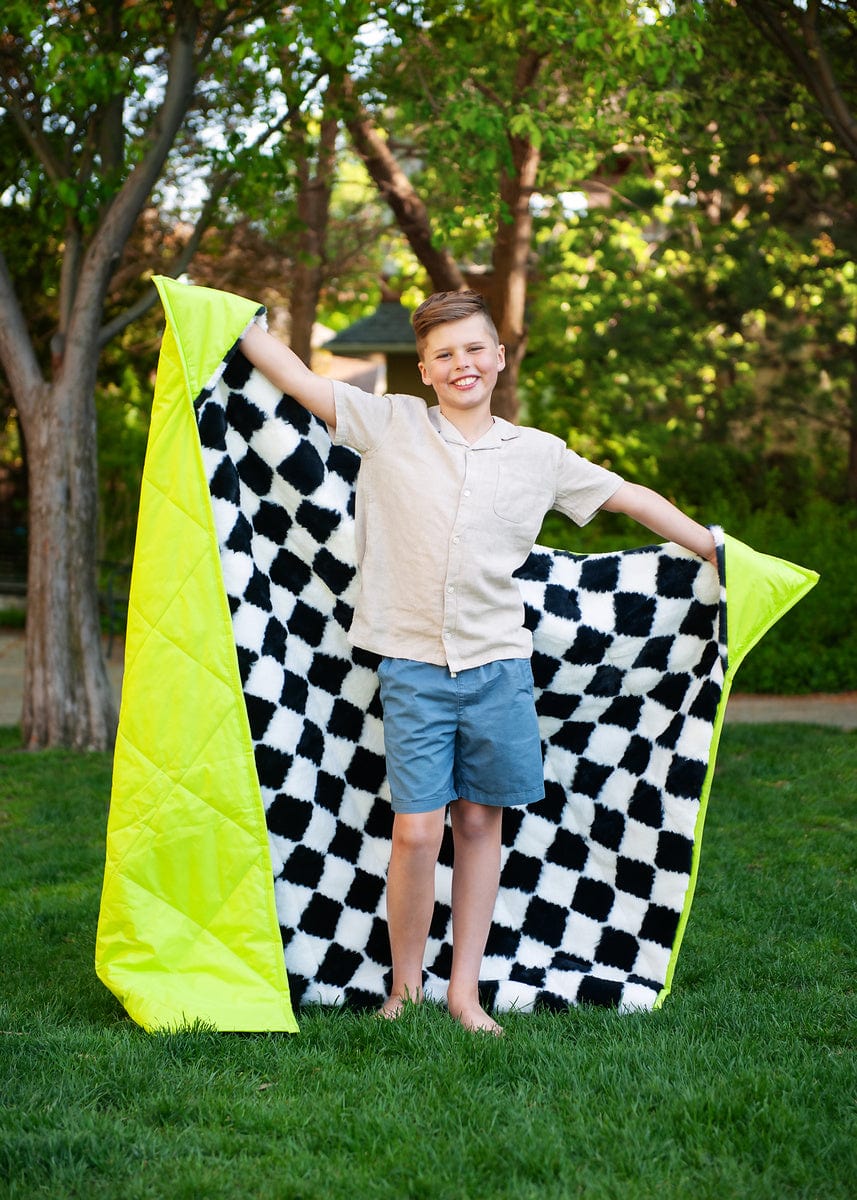 Outdoor blanket perfect for a picnic. watching sports games. camping and more! Outer lining is solid neon yellow with a black and white checkered plush fabric interior.