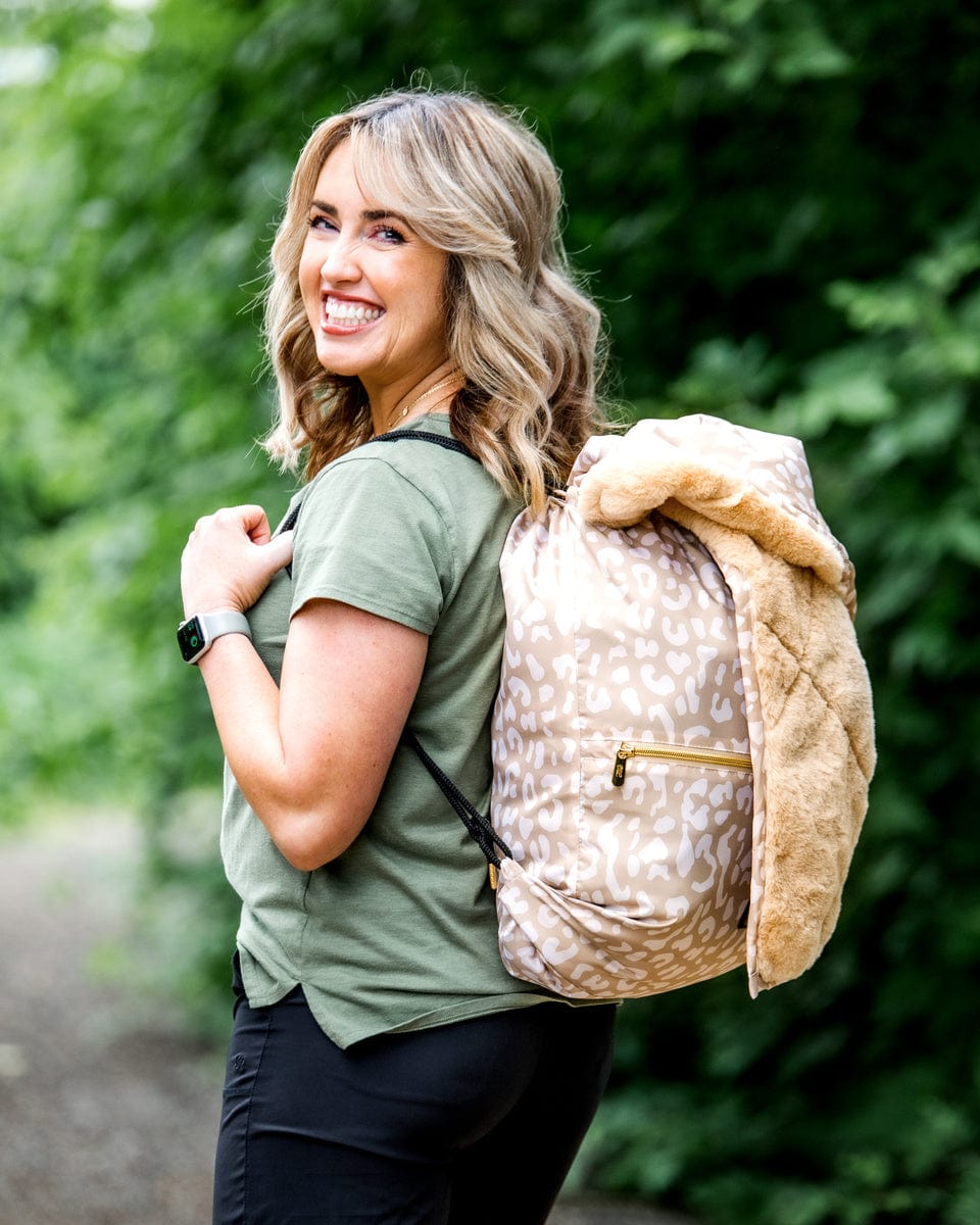 Outdoor blanket perfect for a picnic. watching sports games. camping and more! Outer lining is a tan and cream cheetah print?with a?solid tan?plush fabric interior.