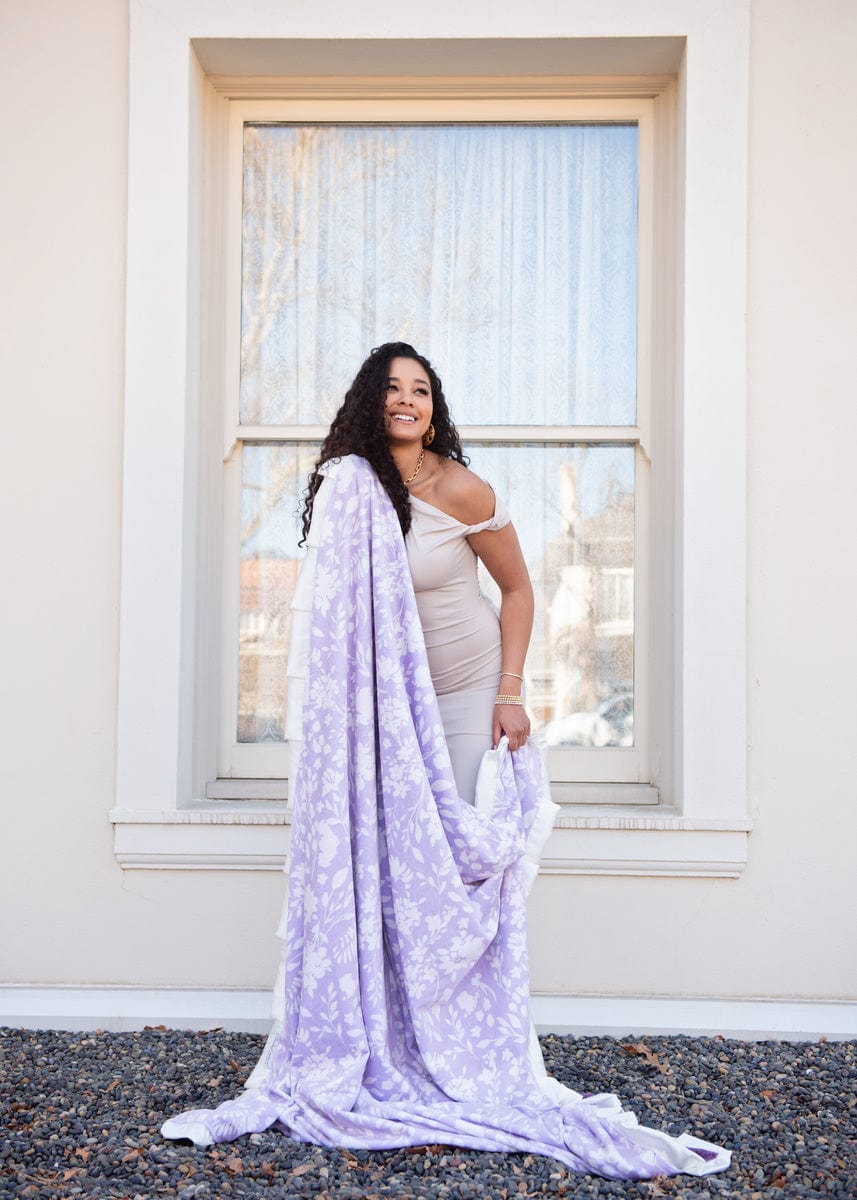 • Details:?Wrap yourself in the charm of the Heather Wildflower Blanket. featuring delicate white flowers blooming across a rich purple background. This soft and cozy blanket brings a touch of elegance and warmth to any space. This blanket is backed in a heather plush minky with a cream?satin ruffle.