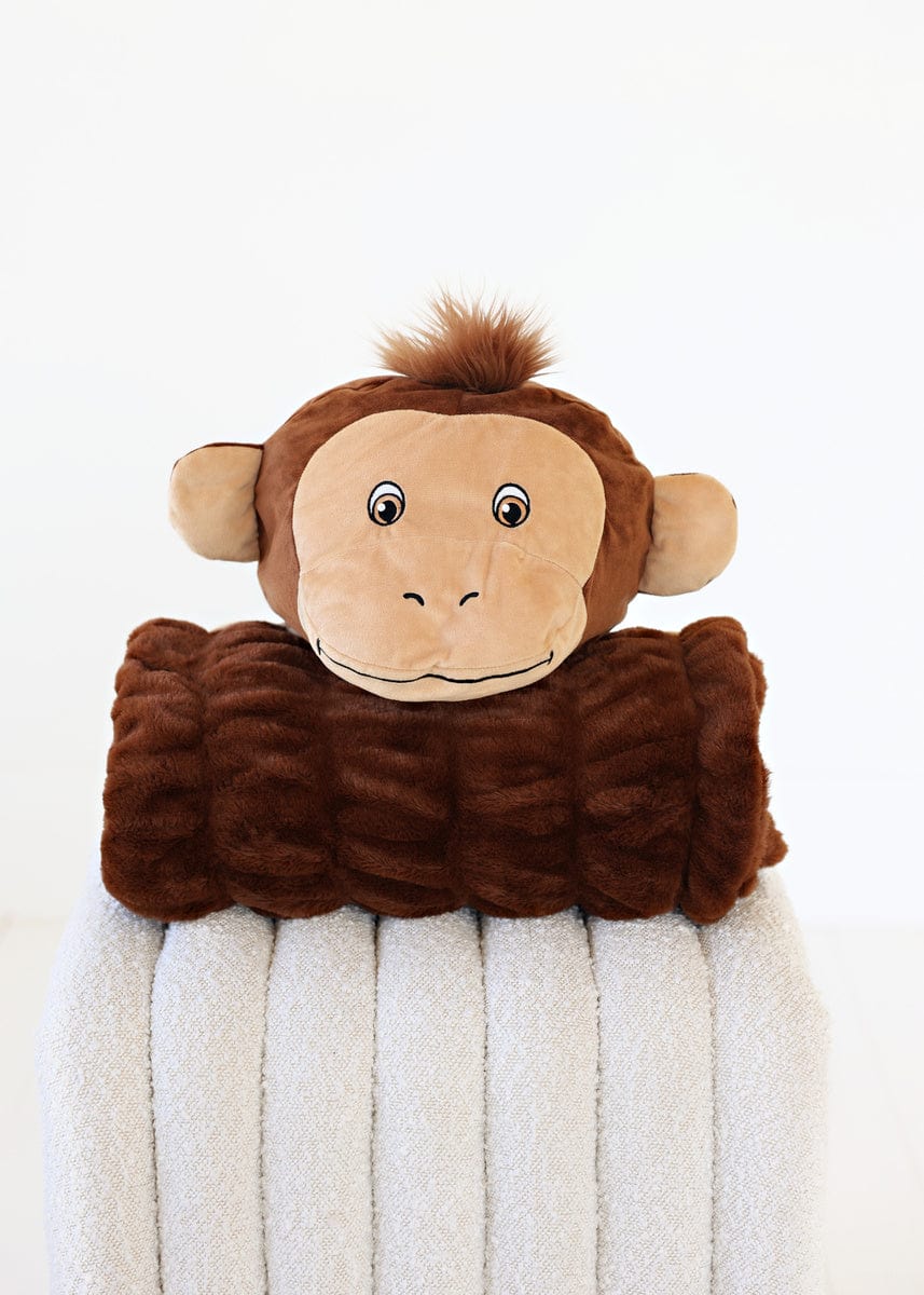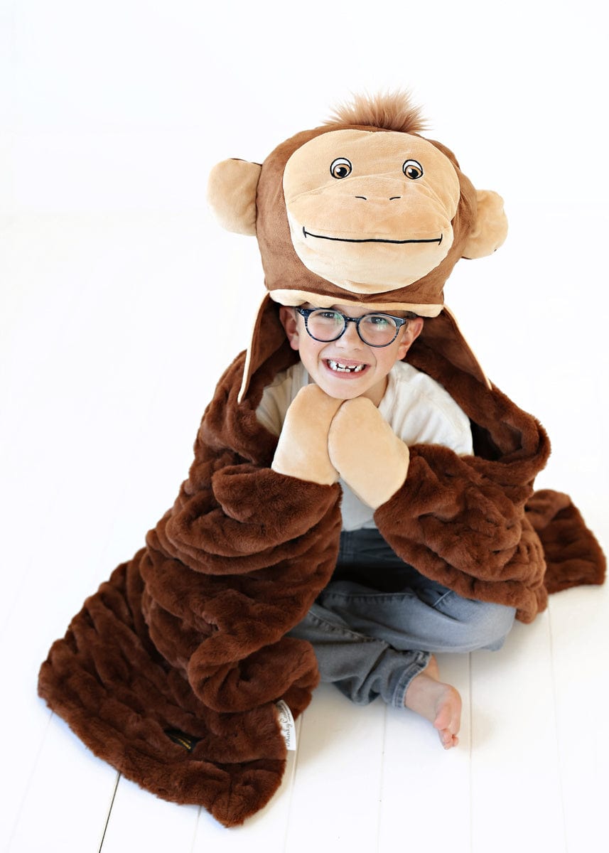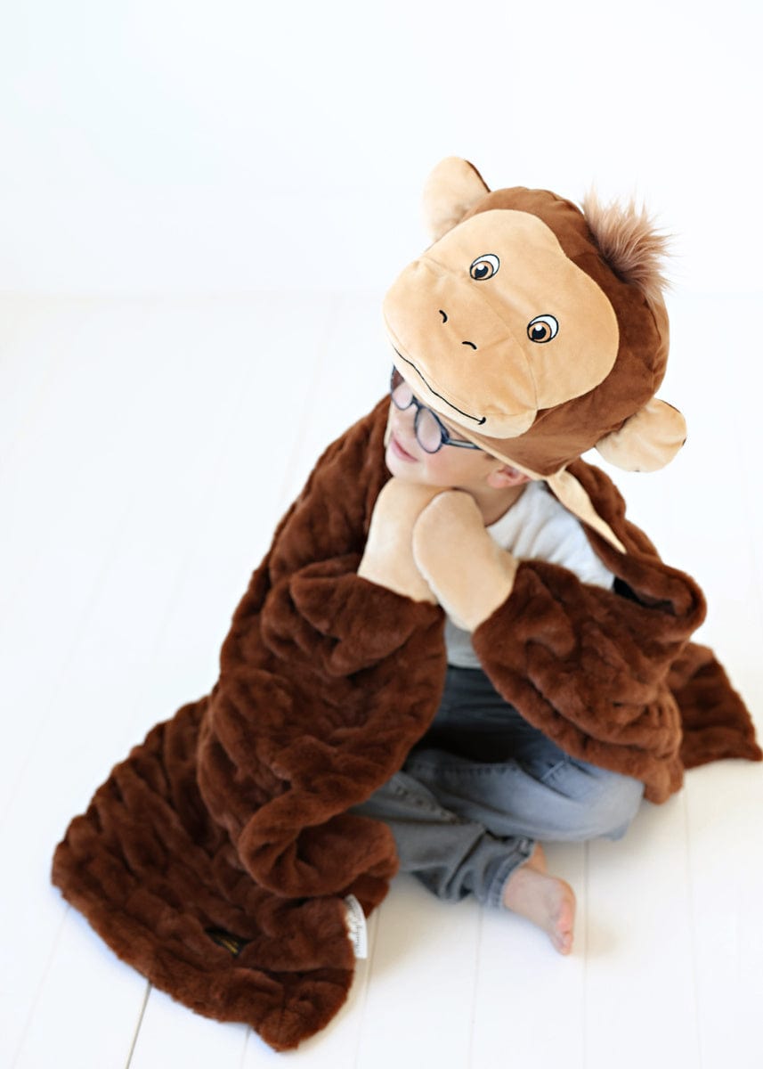 Meet Huggable Monkey. the perfect snuggle companion for your little explorer! This playful brown blanket is designed to bring joy and warmth to every cozy moment. Featuring an adorable monkey head with big. bright eyes and a cheeky grin. it adds a fun twist to cuddle time. Measuring 35×50. this soft and stretchy blanket wraps your child in comfort. making it ideal for imaginative adventures. Watch as they swing into playful escapades with their delightful friend. Huggable Monkey!