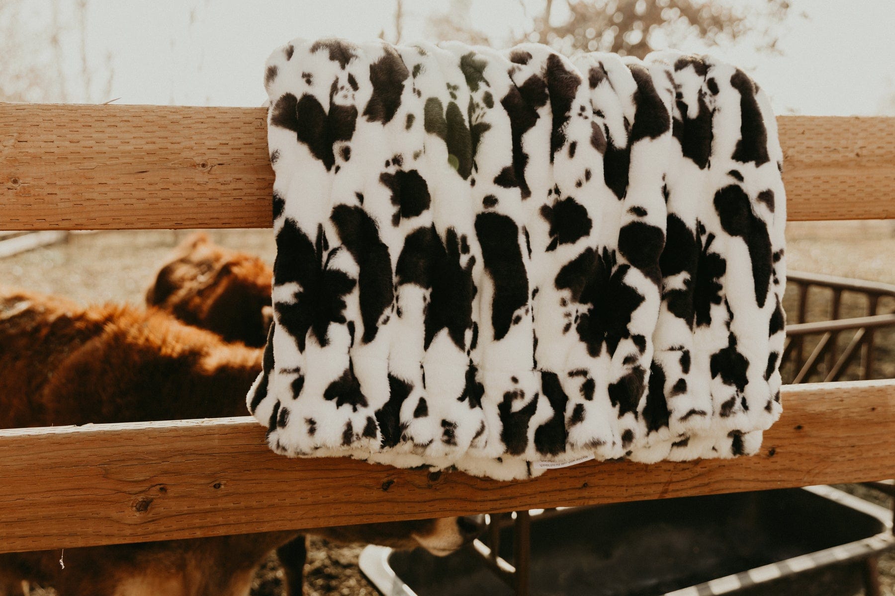 • Details: Wrap yourself in the cozy comfort of the Hugs Cow Blanket. a plush and stretchy design featuring a classic white background with black cow print. Its soft texture and versatile style make it an ideal choice for staying warm and comfortable year-round.