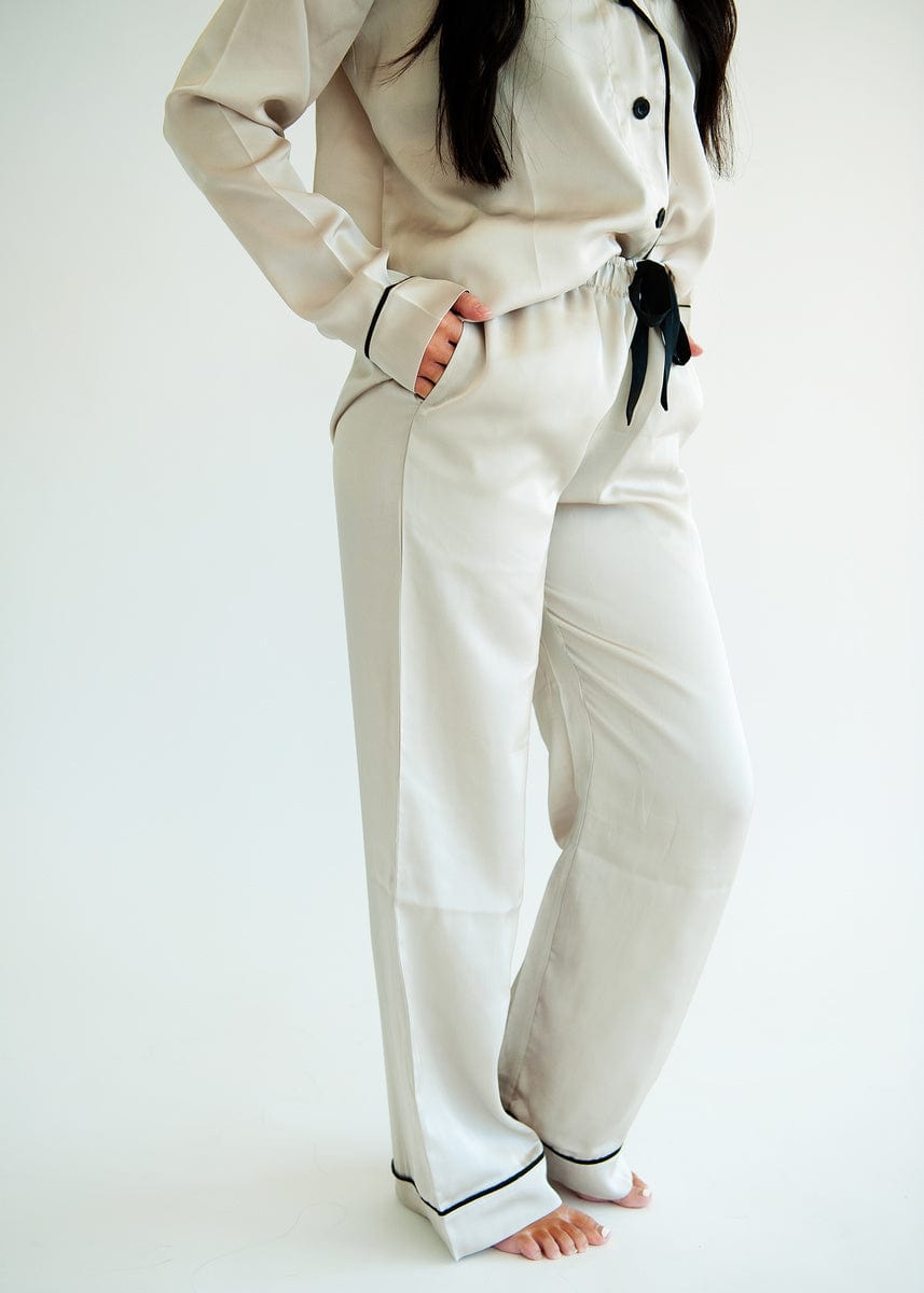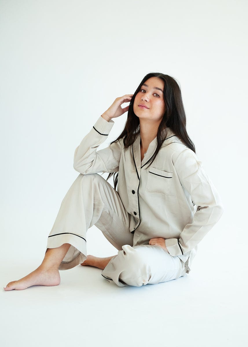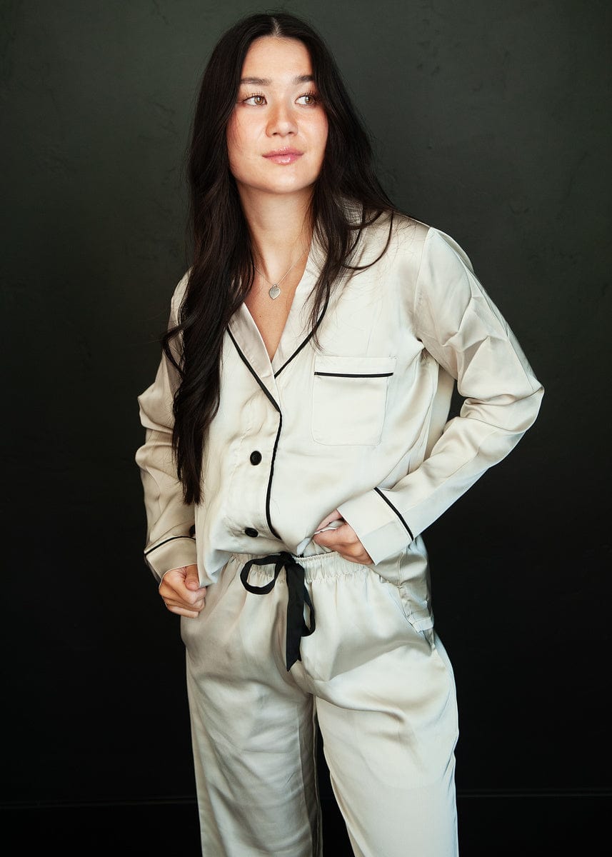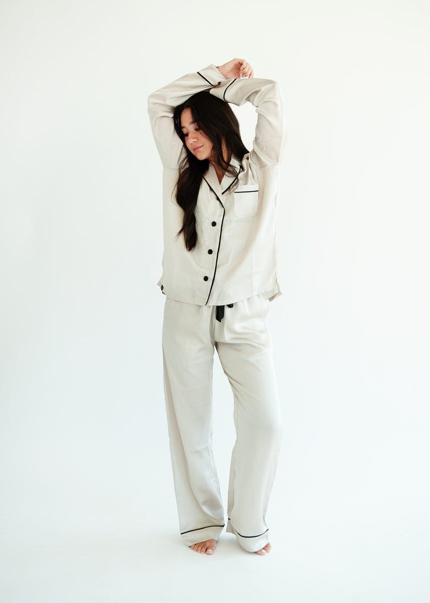 - Description:?You will sleep soundly in our Middle Of The Night set! These classic button up pajamas have long sleeves with an accent trim. a straight leg. and high waisted bottom that look beautiful and fit all body types.