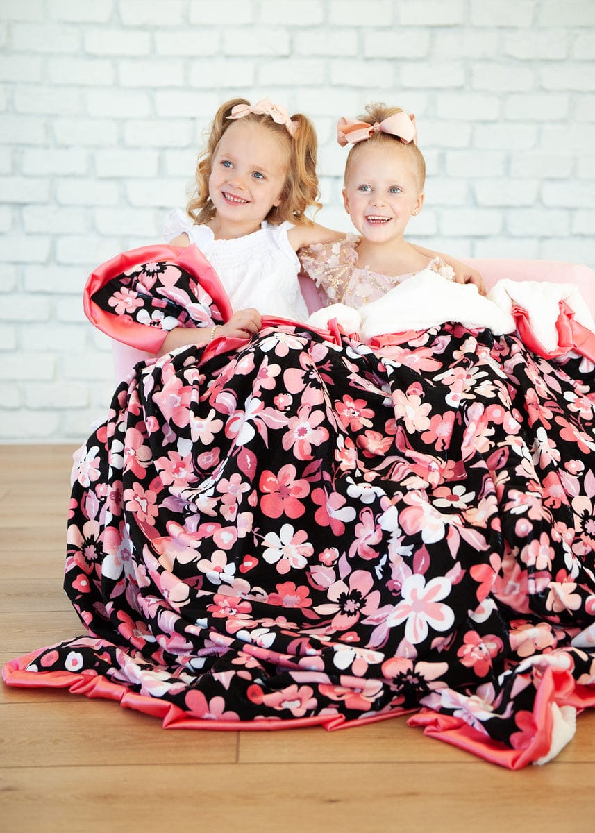 • Details: Introducing Midnight Bloom. where darkness meets the brilliance of nature’s hues. Against a deep black backdrop. a vibrant array of bright pink flowers bursts forth. creating a striking contrast that captivates the eye. Wrap yourself in the allure of the night and the splendor of blossoms with Midnight Bloom. the perfect blend of drama and elegance for cozy evenings. This blanket is backed in a cream plush minky and sewn with a coral satin ruffle.