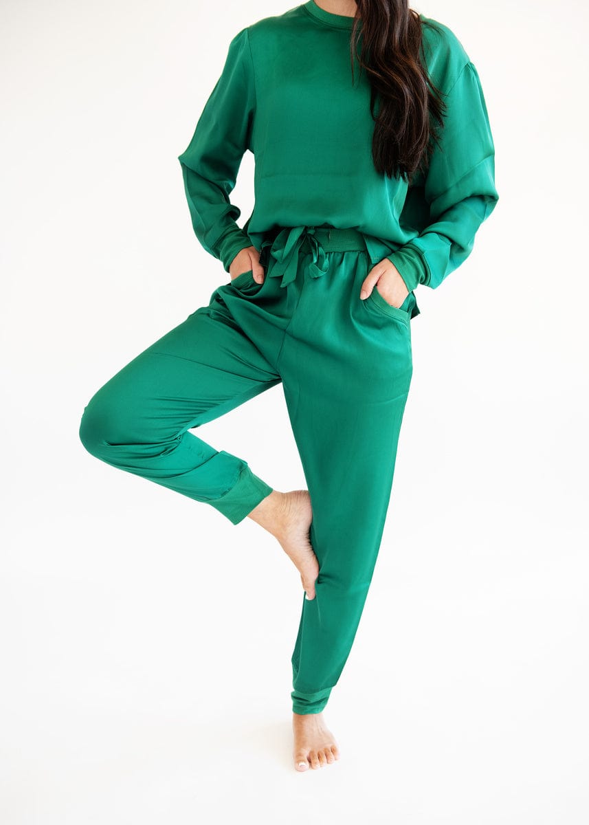 Crafted from 100% high-quality polyester satin. this set features a long sleeve crew neck top with a delicate puff shoulder detail and accent trim at the cuffs. The matching high-waisted jogger pants are effortlessly chic. complete with a comfy drawstring waist. side pockets. and polished cuffed hems for that put-together lounge look.