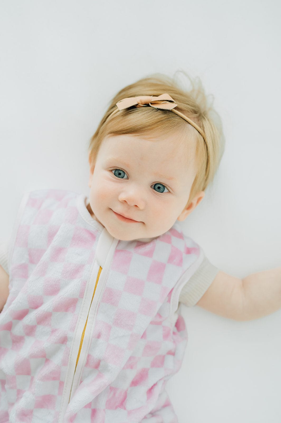 A light pink imperfect check pattern accented with a gold YKK zipper that zips from bottom to top!?
