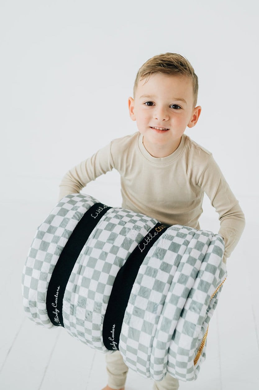 The Little Couture by Minky Couture Sleeping Bag is the perfect cuddly companion to keep you warm and cozy for slumber parties. movie nights and more! The Sleeping Bag includes a Minky Couture Sorbet plush lining and a soft minky shell. The built-in pillow makes it easy and functional to take on the go! The attached elastic straps provide a simple way to roll and store your bag. The Sleeping Bag comes in a protective draw-string carrying bag – that includes an adjustable strap for carrying and name tag for personalization.??